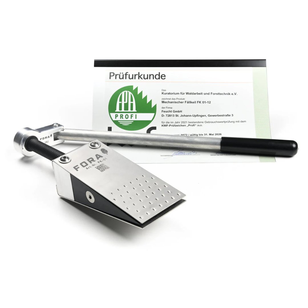 Der mechanische Fällkeil FK-01-12-R in der Ausführung für die Ratsche ist der perfekte Begleiter bei der Holzernte. Mit seinem Eigengewicht von nur 1,65 kg (ohne Ratsche & Tasche) ist er für den täglichen Einsatz im Wald geeignet. Der Fällkeil zeichnet sich durch Krallbleche/Haltebleche aus Federstahl mit neuartig ausgebogenen Haltezähnen/Krallen aus, welche sehr scharfkantig ausgeführt und deren Kavitäten rücklinks gegen das Zurückbiegen verschweißt und geglättet sind. Die Haltezähne sichern einen sehr guten Selbsthalt des Keils gegen das Herausrutschen aus dem Sägespalt, da sie bestens ins Baumholz des Sägespalts eingreifen. Außerdem besitzt er einen leichtgängigen und selbst schmierenden Gleitkeil aus speziellem Kunststoff, der den Fällkeil aufweitet. Mit bis zu 12 Tonnen Hubkraft haben sie einen sicheren und praktischen Helfer beim Baumfällen an ihrer Seite.