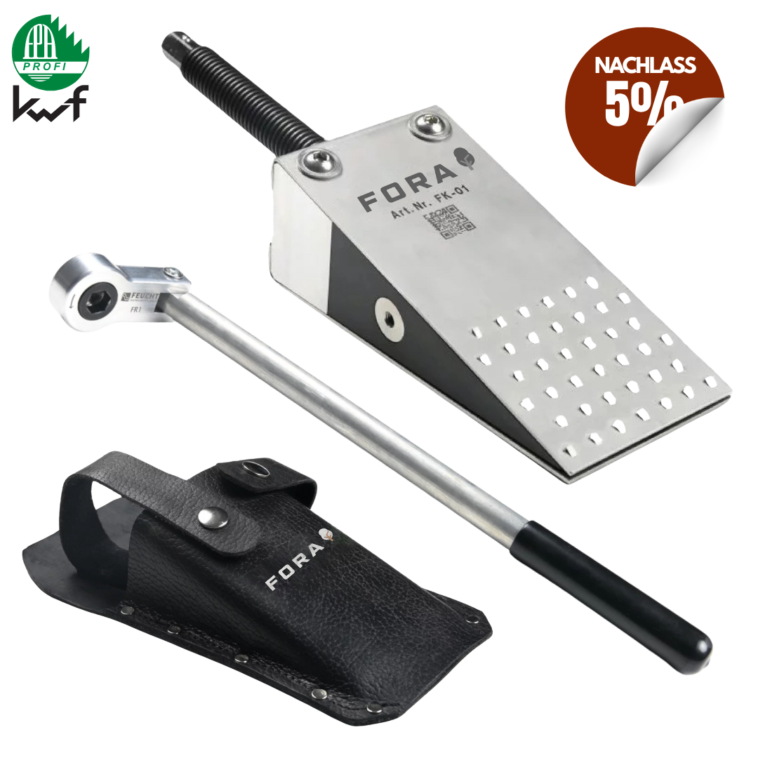 Dieses Set mit 5% Nachlass besteht aus einem mechanischer Fällkeil FK 01-12 R, der dazugehörigen Ratsche (Alu oder Stahl) & der Transport-Ledertasche FL-01.